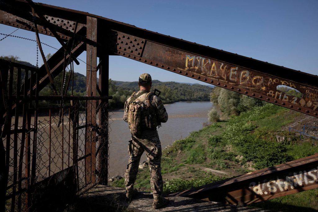 FILE PHOTO: A Ukrainian border guard surveys the border to Romania looking for people who cross illegally including men attempting to flee abroad to avoid military service, in Tyachiv, September 26, 2023. REUTERS/Thomas Peter/File Photo